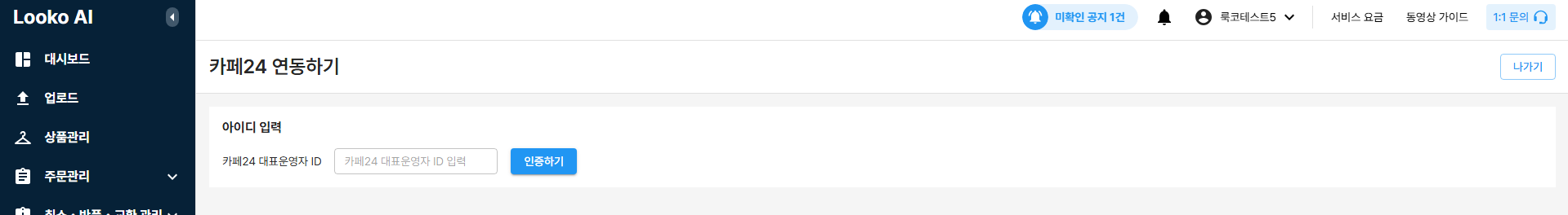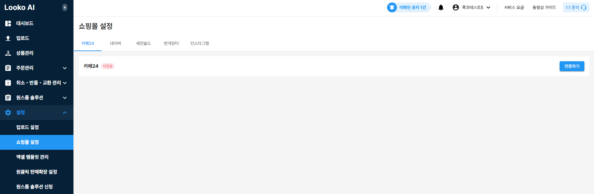 Looko-AI (PC) > 설정 > 쇼핑몰 설정 > 카페24 탭 > 연동하기